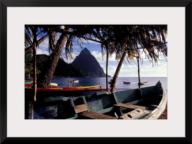 <p>Caribbean, BWI, St. Lucia, Fishing boats and Pitons, Soufriere.</p>
