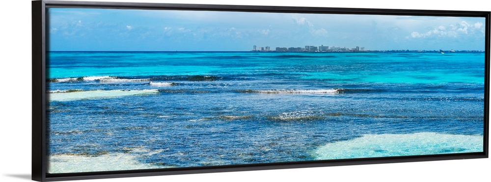 <p>Panoramic photograph of the clear blue Caribbean ocean with the Cancun skyline in the background. From the Viva Mexico Panoramic Collection.</p>