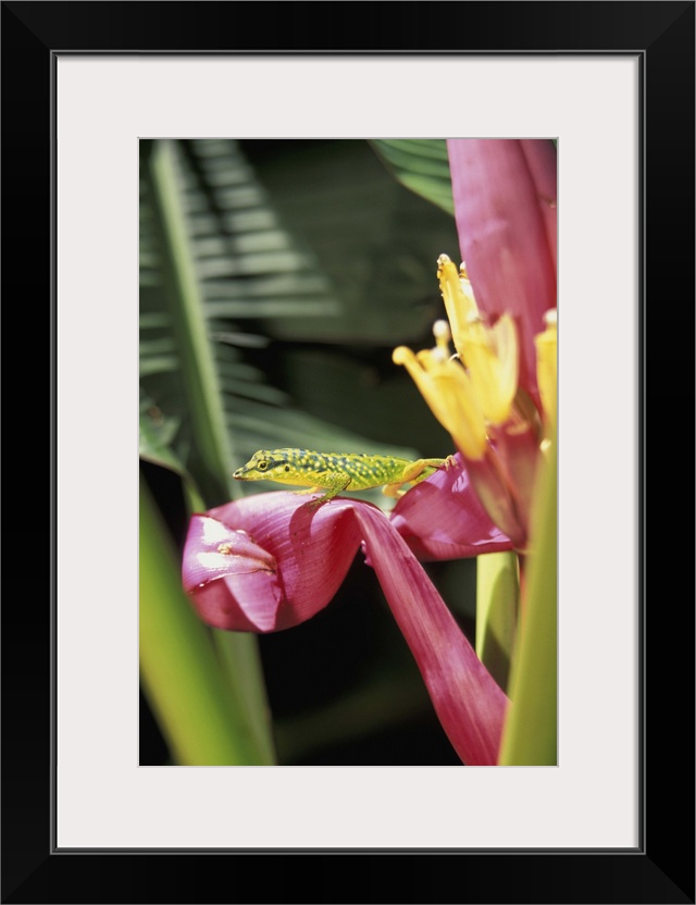 <p>Caribbean, French West Indies, Martinique.Jardin de Balata; Banana flower with lizard</p>