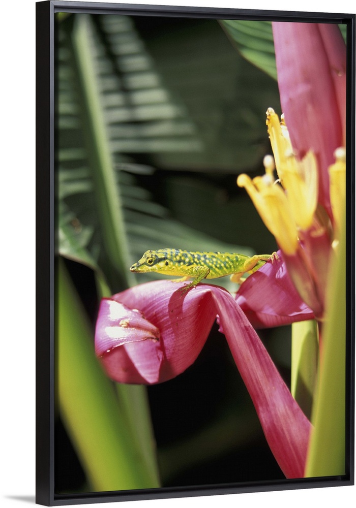 <p>Caribbean, French West Indies, Martinique.Jardin de Balata; Banana flower with lizard</p>