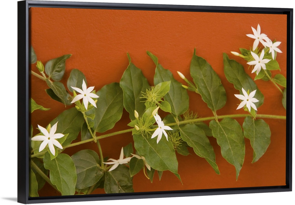 <p>Caribbean, Netherland Antilles, Curacao, Willemstad. Flowering vine on red wall.</p>