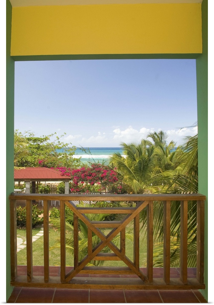 <p>Caribbean, Puerto Rico, Vieques. Caribbean, beach and palm trees, viewed from porch of house/hotel. PR</p>