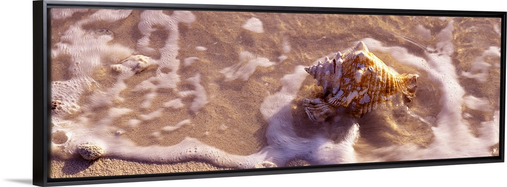 <p>Long panoramic artwork of a sea shell on the beach with water hitting it.</p>
