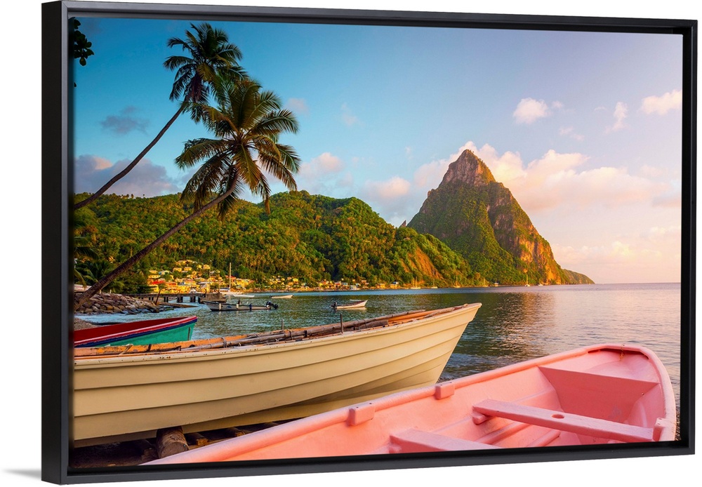 <p>Caribbean, St Lucia, Soufriere, Soufriere Bay, Soufriere Beach and Petit Piton (UNESCO World Heritage Site), Traditional Fishing Boats</p>