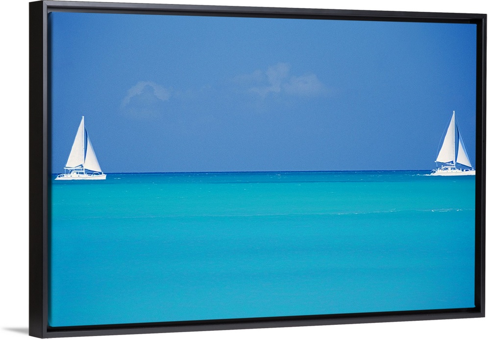 <p>Canvas print of two sailboats floating in clear ocean water with one on the left and one on the right.</p>