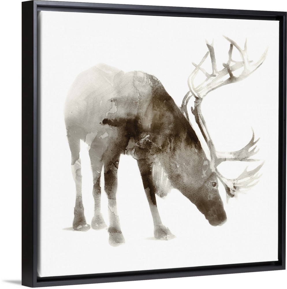 <p>Watercolor painting of a caribou with large antlers in brown tones.</p>