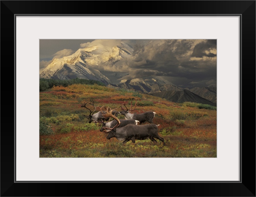 <p>Compostie Caribou Graze On Tundra During Autumn With Mt. Mckinley In The Background In Denali National Park, Alaska Composite</p>