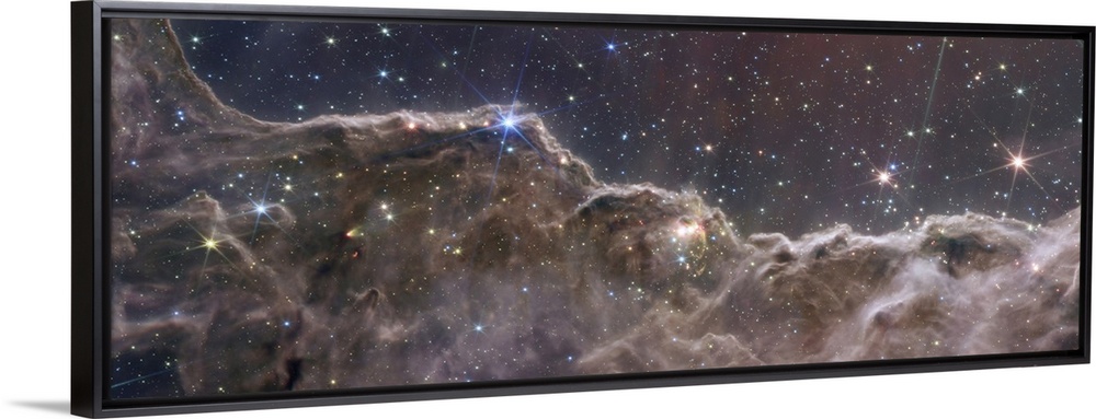 <p>Astronomers using NASAs James Webb Space Telescope combined the capabilities of the telescopes two cameras to create a never-before-seen view of a star-forming region in the Carina Nebula. Captured in infrared light by the Near-Infrared Camera (NIRCam) and Mid-Infrared Instrument (MIRI), this combined image reveals previously invisible areas of star birth. What looks much like craggy mountains on a moonlit evening is actually the edge of a nearby, young, star-forming region known as NGC 3324. Called the Cosmic Cliffs, this rim of a gigantic, gaseous cavity is roughly 7,600 light-years away. The cavernous area has been carved from the nebula by the intense ultraviolet radiation and stellar winds from extremely massive, hot, young stars located in the center of the bubble, above the area shown in this image. The high-energy radiation from these stars is sculpting the nebulas wall by slowly eroding it away. NIRCam with its crisp resolution and unparalleled sensitivity unveils hundreds of previously hidden stars, and even numerous background galaxies. In MIRIs view, young stars and their dusty, planet-forming disks shine brightly in the mid-infrared, appearing pink and red. MIRI reveals structures that are embedded in the dust and uncovers the stellar sources of massive jets and outflows. With MIRI, the organic, soot-like material on the surface of the ridges glows, giving the appearance of jagged rocks.</p>