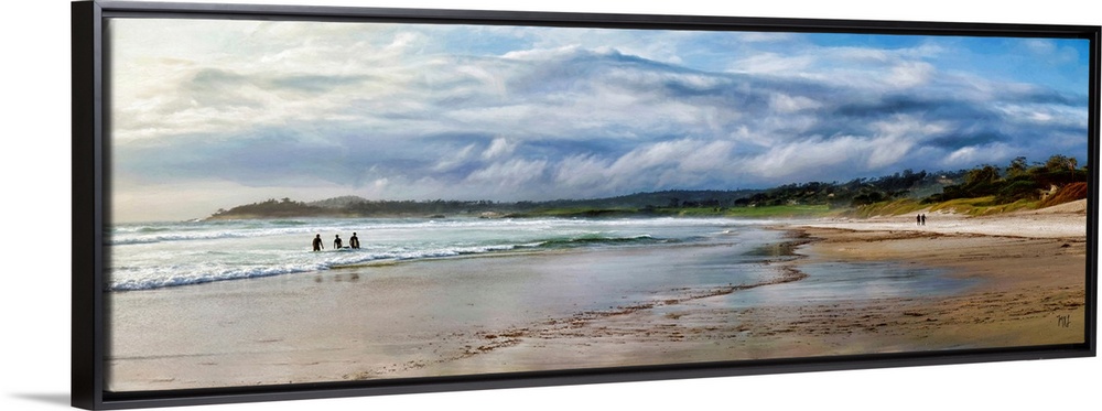 <p>As evening draws near in Carmel-by-the-Sea, three young boogie-borders prepare to take to the waves, while two women take a stroll on the beach. In the foreground, the sky and ocean are reflected on wet sand adorned with sea kelp. In the distance, one can see portions of the acclaimed Pebble Beach Golf Links and cloud formations that add soothing textures to the scene.</p>