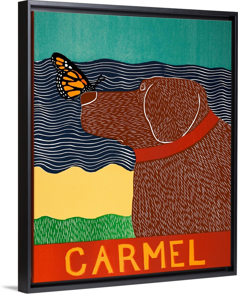 <p>Illustration of a chocolate lab at the beach in Carmel with an orange butterfly on its nose and "Carmel" written at the bottom.</p>