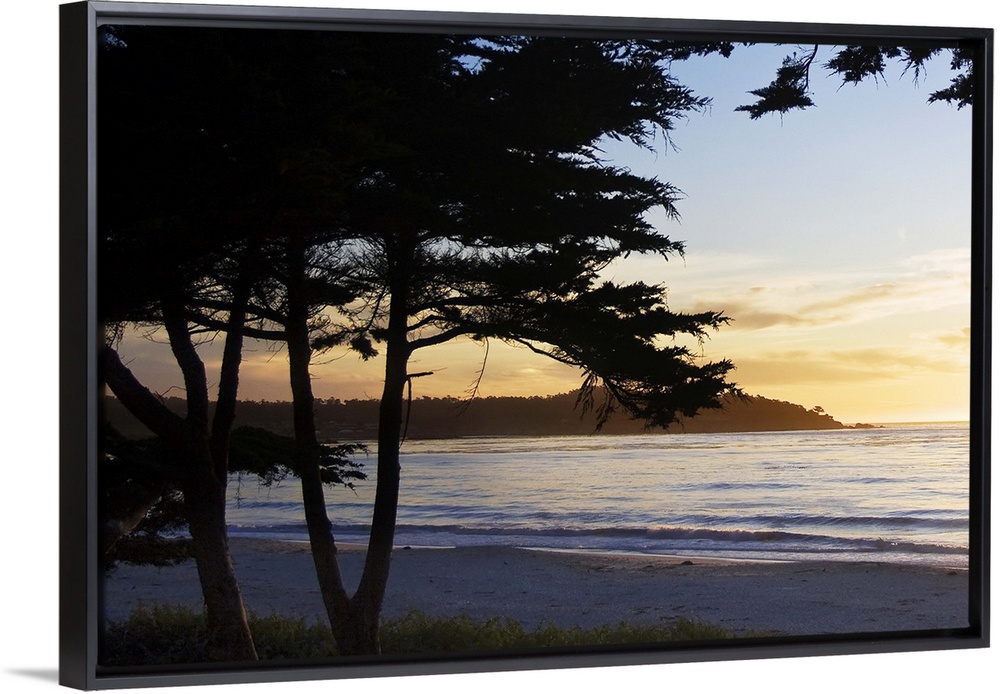 <p>silhouettes of trees in front of an ocean sunset in Carmel, California.</p>