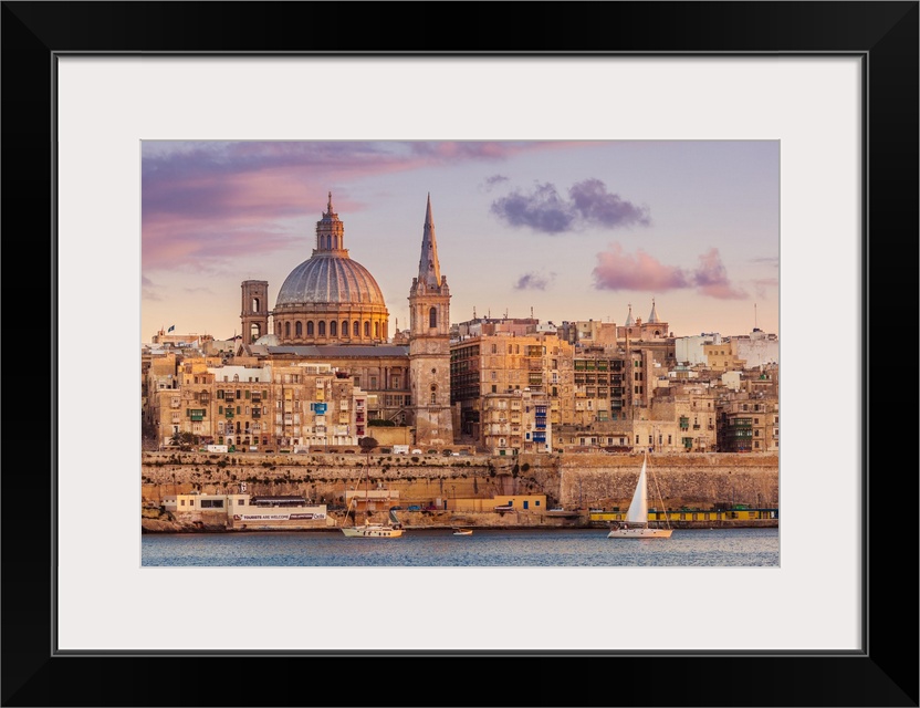 <p>Valletta skyline at sunset with the Carmelite Church dome and St. Pauls Anglican Cathedral, Valletta, Malta, Mediterranean, Europe</p>