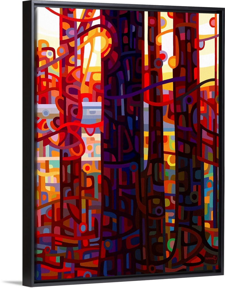 <p>Mandy Budan’s art style is more than unique. Using acrylic colors to weave lines and shapes together like a tapestry, she creates breathtaking images from the simplest forms. Though the multicolored dots of “Standing Room Only” may seem like a scattering of disparate, broken circles up close, a step back reveals a stunning forest scene reminiscent of stained glass. In “Solitaire,” a close examination reveals an intricate collection of interlocking pieces, almost like peeking at the delicate harmony of gears in a pocket watch. Yet again, a step away from the canvas transforms her design into an unrestricted dance of fluid lines and curves in a blossom. Whether it’s the soft floral pinks of “Cascade,” the gold turning crimson in “Stormlight,” or the sweeping blues of “Thaw,” wall art from Mandy Budan adds more than color to a room; it invites visitors to discover something new each time they encounter it.</p>
