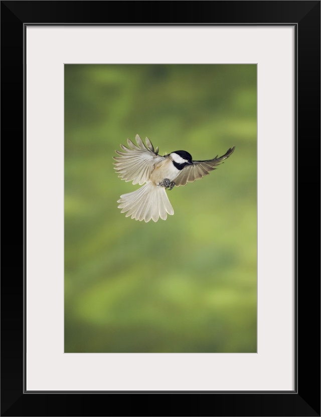 <p>Carolina Chickadee, (Poecile carolinensis), adult in flight, New Braunfels, Hill Country, Texas, USA, November 2005</p>