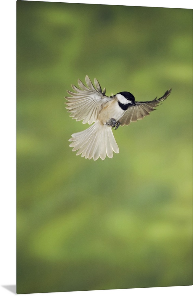 <p>Carolina Chickadee, (Poecile carolinensis), adult in flight, New Braunfels, Hill Country, Texas, USA, November 2005</p>