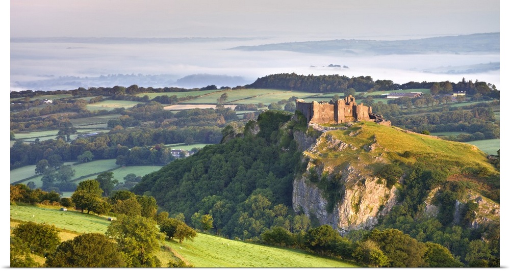 <p>Carreg Cennen Castle at dawn on a misty summer morning, Brecon Beacons National Park, Carmarthenshire, Wales, UK. Summer, August, 2009.</p>