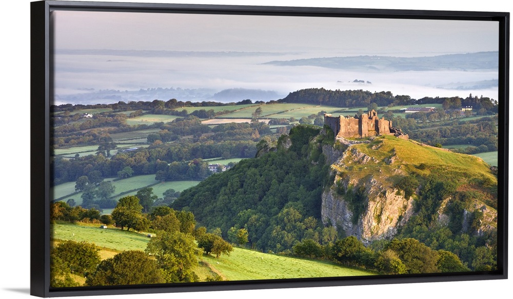 <p>Carreg Cennen Castle at dawn on a misty summer morning, Brecon Beacons National Park, Carmarthenshire, Wales, UK. Summer, August, 2009.</p>