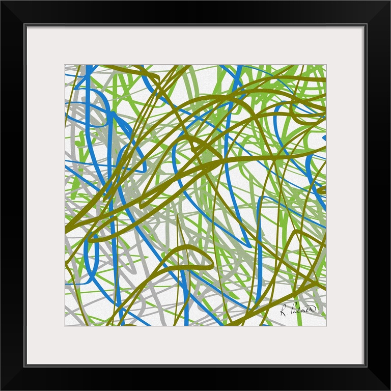 <p>Contemporary abstract painting of a web of blue and green lines against a white background.</p>