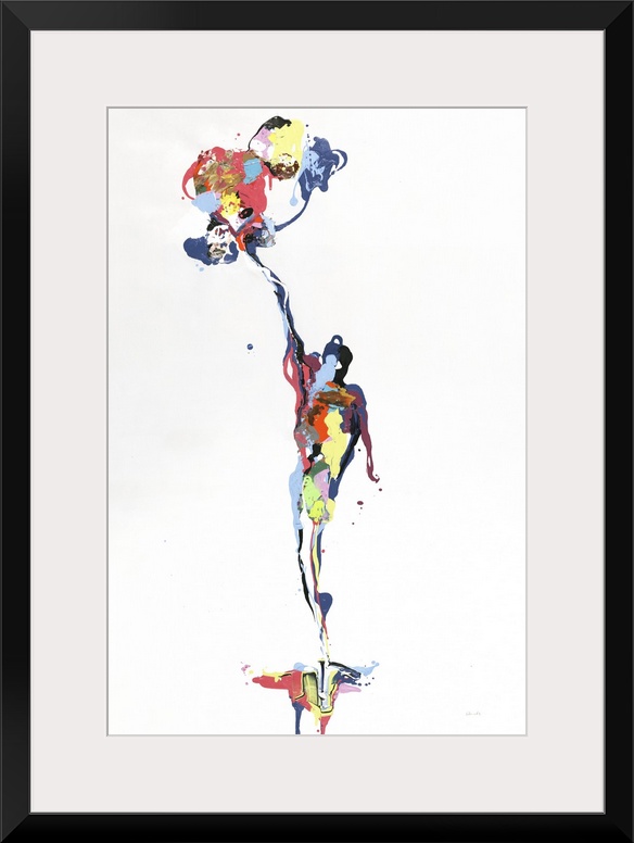 <p>Colorful abstract painting resembling a figure floating up off the ground with a cluster of balloons in its hand.</p>