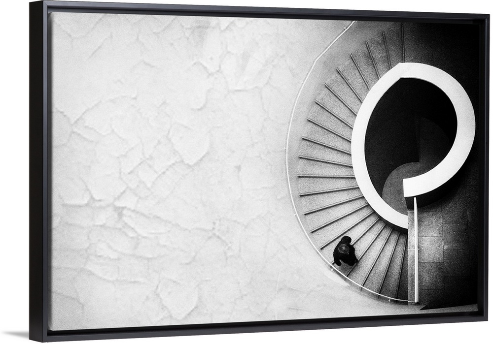 <p>Aerial view of a curved staircase with a person walking down.</p>