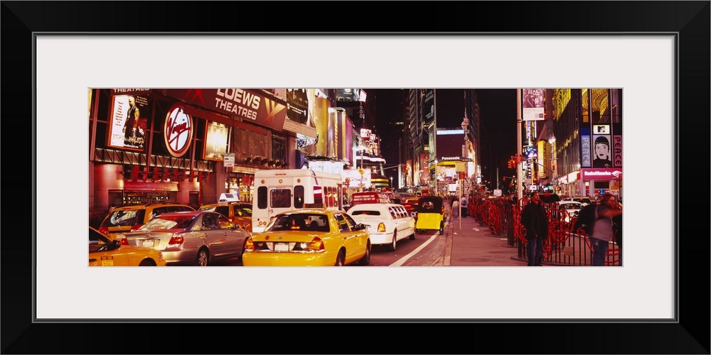 <p>Panoramic photograph of many cars and taxis filling the street in Times Square, surrounded by the bright lights and billboards at night, in New York City.</p>