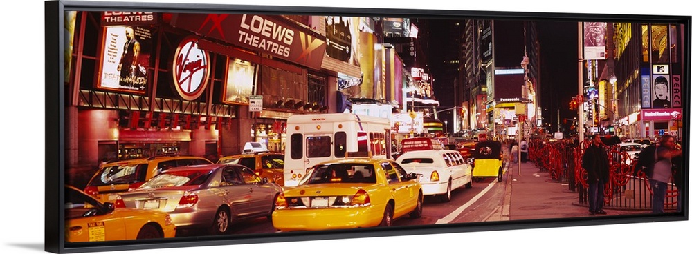 <p>Panoramic photograph of many cars and taxis filling the street in Times Square, surrounded by the bright lights and billboards at night, in New York City.</p>
