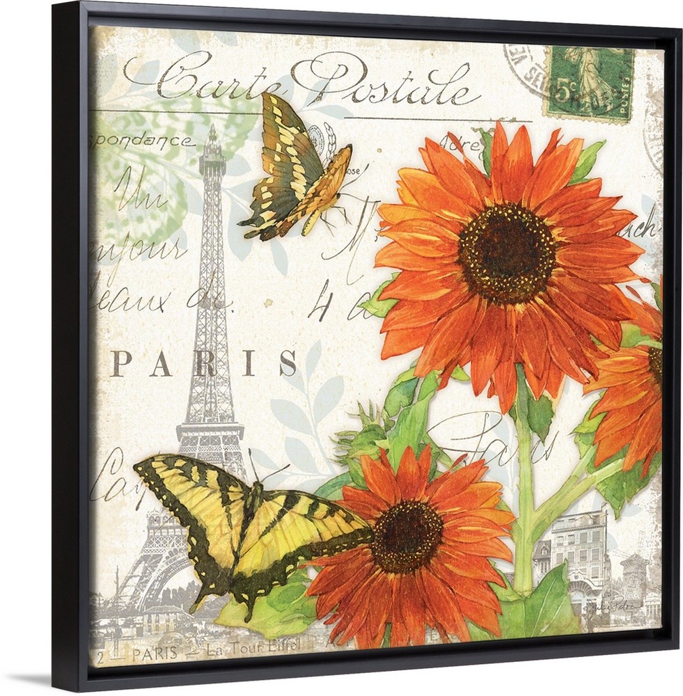 <p>Square decor with watercolor painted orange sunflowers and yellow butterflies on a white background with an illustration of the Eiffel Tower and French text.</p>