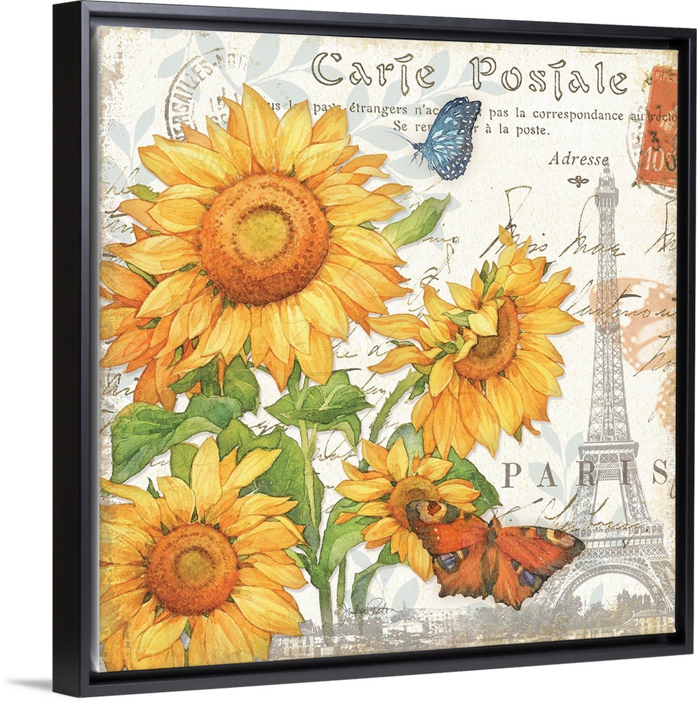 <p>Square decor with watercolor painted sunflowers and two butterflies on a white background with an illustration of the Eiffel Tower and French text.</p>