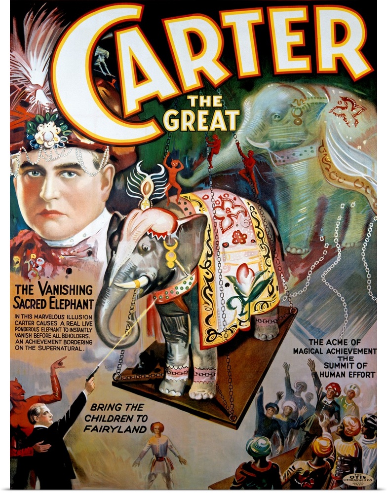 <p>Oversized, portrait, vintage advertisement for "Carter the Great", featuring a portrait of the magicians face wearing a fanciful hat on his head. He is surrounded by collage imagery of his acts, including "The Vanishing Sacred Elephant".</p>