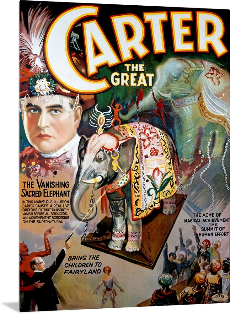 <p>Oversized, portrait, vintage advertisement for "Carter the Great", featuring a portrait of the magicians face wearing a fanciful hat on his head. He is surrounded by collage imagery of his acts, including "The Vanishing Sacred Elephant".</p>
