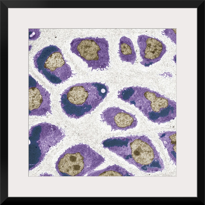 <p>Cartilage cells. Coloured transmission electron micrograph (TEM) of a section through chondrocytes from nasal hyaline cartilage. The cell nuclei (brown) can be seen along with rough endoplasmic reticulum (light purple lines) and glycogen granules (dark purple dots). Chondrocytes are the only cells found in cartilage. Hyaline cartilage is found in the epiphyseal plates of growing bones, and in the nose, larynx (voice box), trachea (windpipe) and bronchus. These cells produce and maintain the cartilage's extracellular matrix. Magnification: x800 when printed 10 centimetres wide.</p>