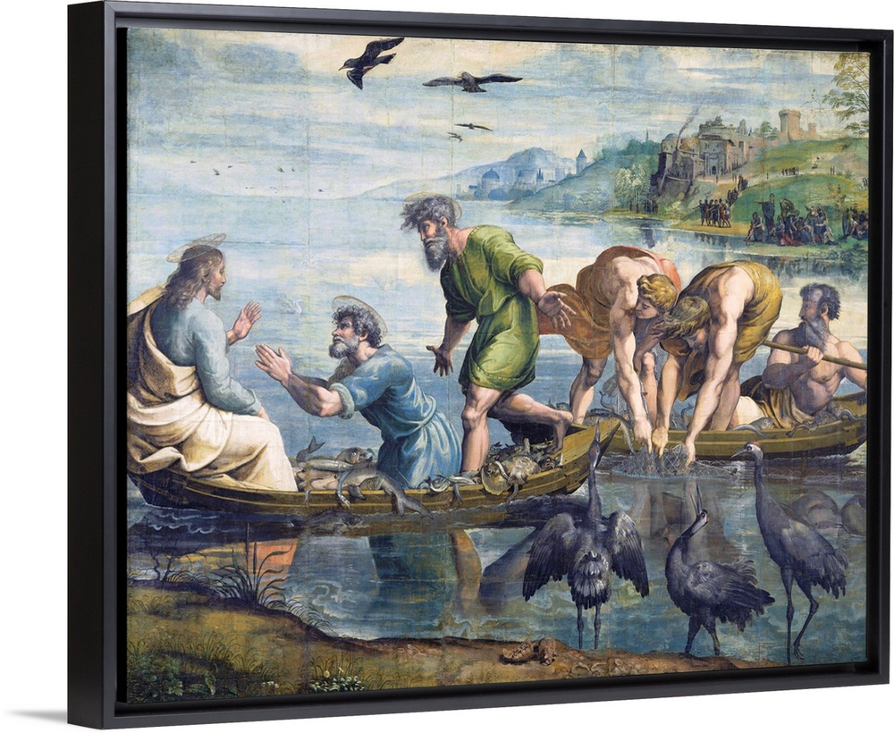<p>Full-scale painting for The Miraculous Draught of Fishes tapestry. Circa 1515-16 by Raphael and assistants. Bodycolor over charcoal underdrawing on paper, mounted on canvas. 319 x 399 cm. Located in the Royal Collection of Her Majesty Queen Elizabeth II, England, UK.</p>