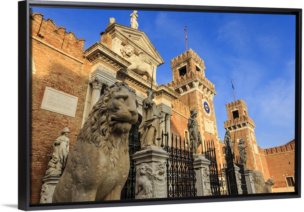 <p>Carved lions and statues, Porta Magna, Arsenale, in winter afternoon sun, Castello, Venice, Veneto, Italy</p>
