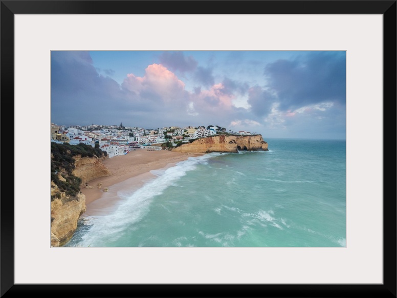 <p>View of Carvoeiro village surrounded by sandy beach and turquoise sea at sunset, Lagoa Municipality, Algarve, Portugal</p>