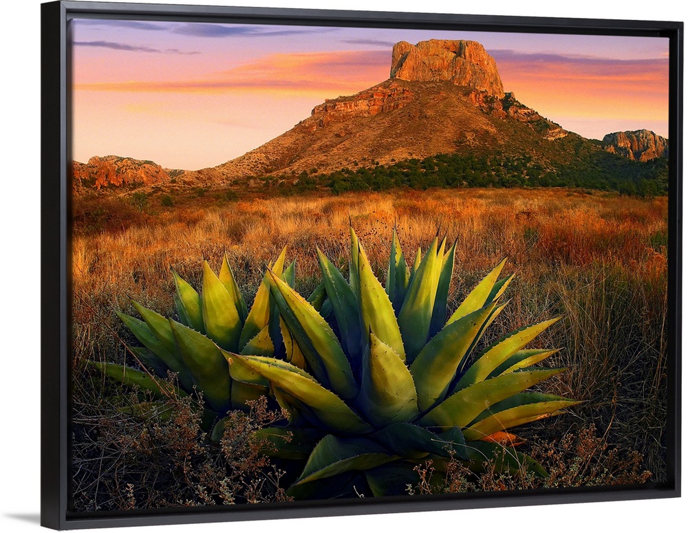 <p>Horizontal, large photograph of Agave plants in a large field, Casa Grande butte in the background, in Big Bend National Park, Texas.</p>