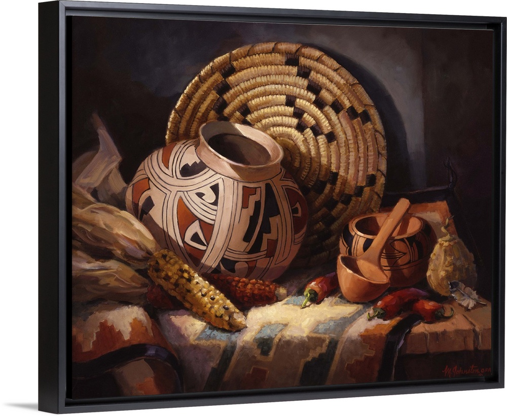 <p>Maxine Johnston's still life oil paintings are influenced by her Southwestern surroundings and generally include Native American cultural objects.</p>