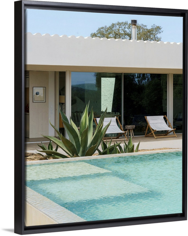 <p>A cool-toned photograph of an outdoor mediterranean swimming pool and villa.</p>