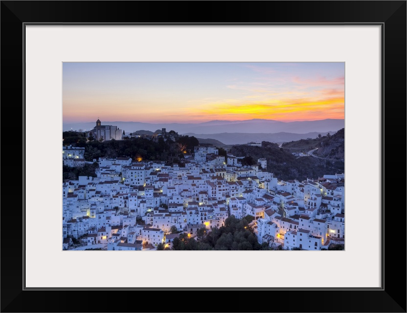 <p>Elevated view over the dramatic hilltop village of Casares illuminated at sunset, Casares, Malaga Province, Andalusia, Spain</p>