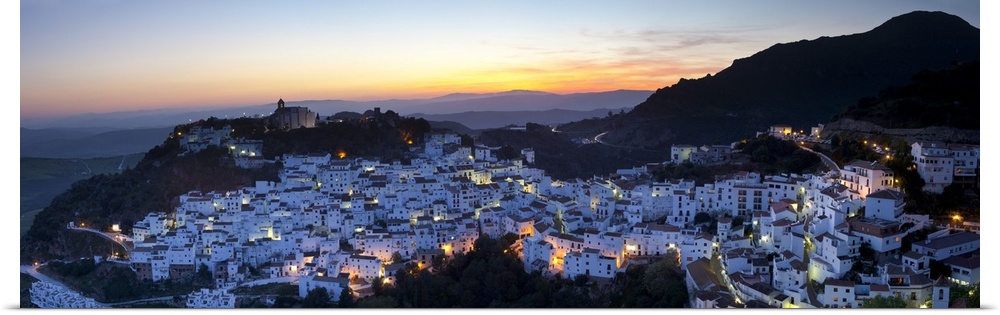 <p>Elevated view over the dramatic hilltop village of Casares illuminated at sunset, Casares, Malaga Province, Andalusia, Spain</p>
