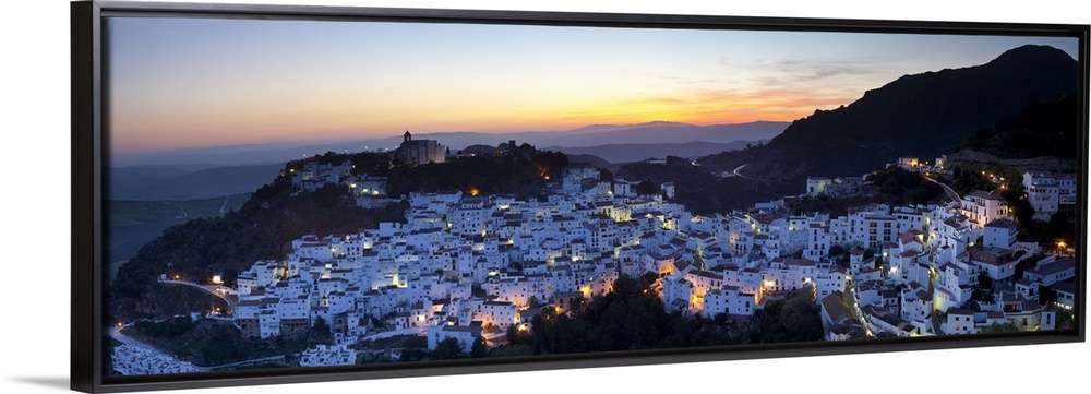 <p>Elevated view over the dramatic hilltop village of Casares illuminated at sunset, Casares, Malaga Province, Andalusia, Spain</p>