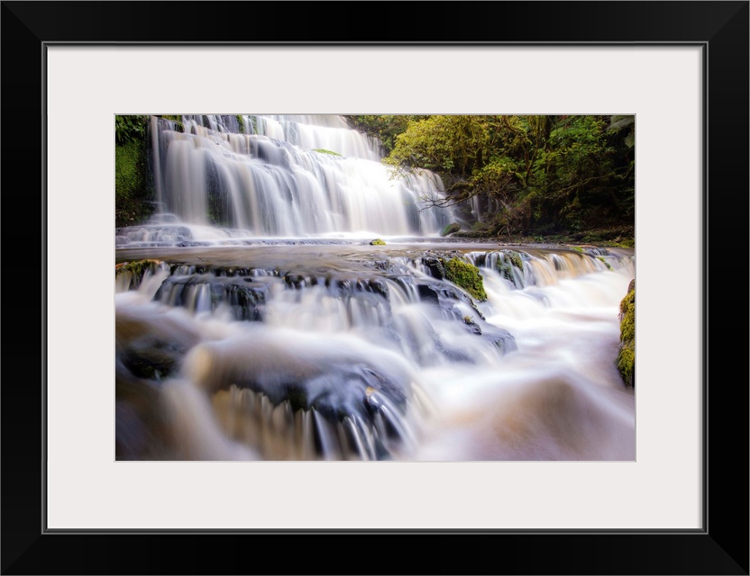 <p>Long exposure photograph of a rushing waterfall surrounded by lush green foliage.</p>
