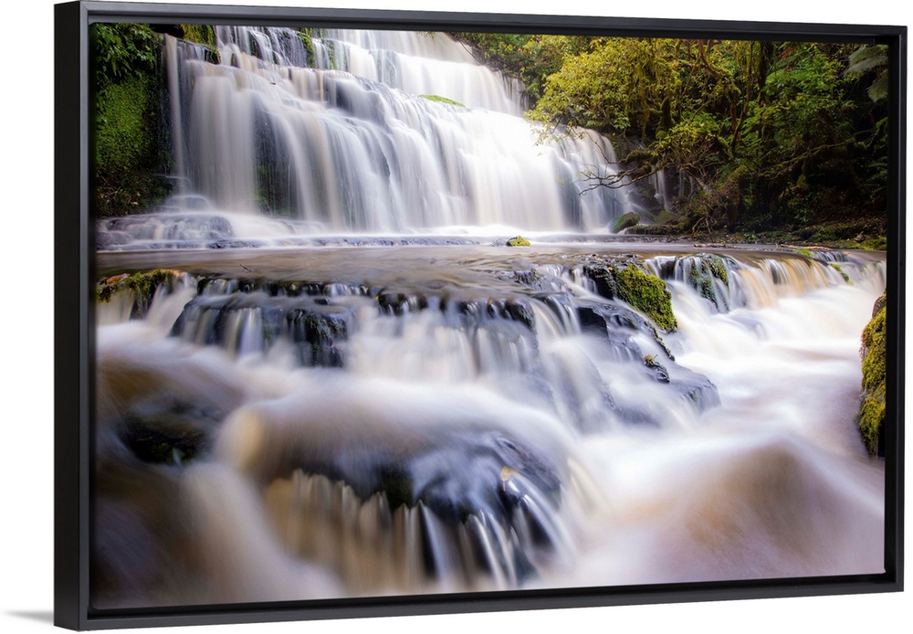 <p>Long exposure photograph of a rushing waterfall surrounded by lush green foliage.</p>
