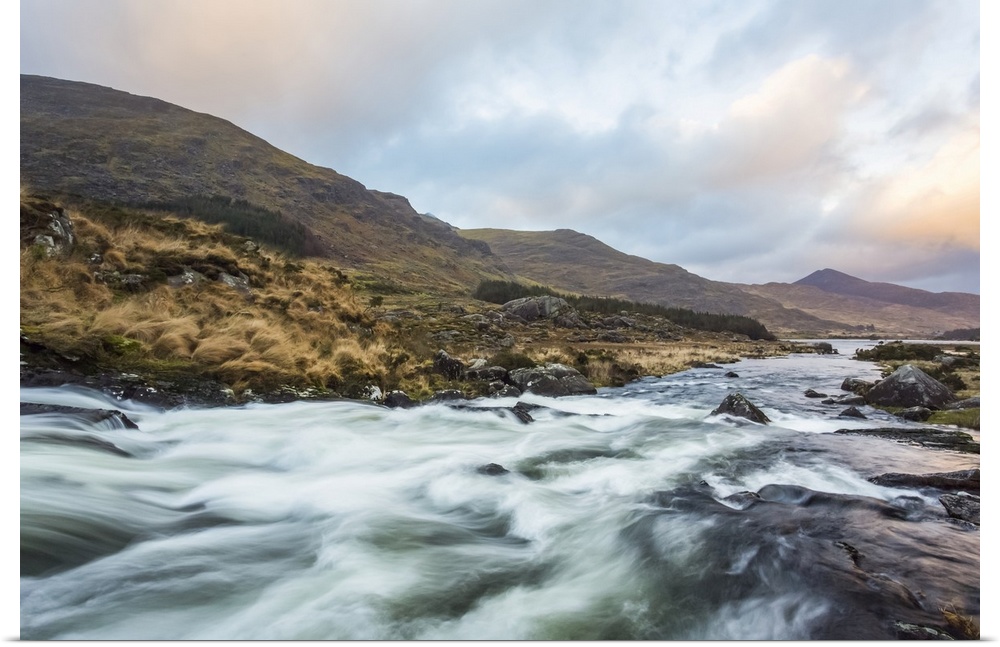 <p>Cascades on a river in the Black Valley in Kerry with the MacGillycuddy's Reeks in the background on a cloudy day; County Kerry, Ireland.</p>