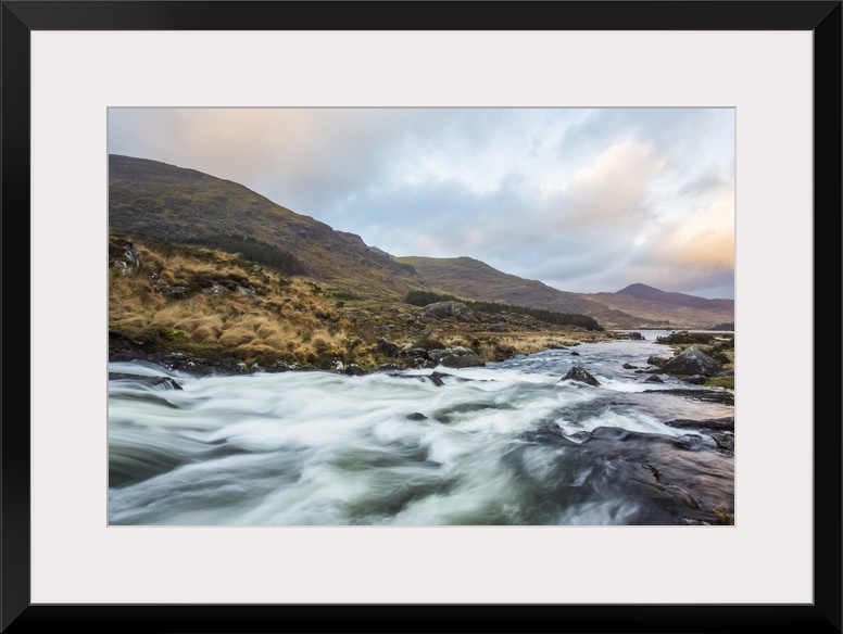 <p>Cascades on a river in the Black Valley in Kerry with the MacGillycuddy's Reeks in the background on a cloudy day; County Kerry, Ireland.</p>