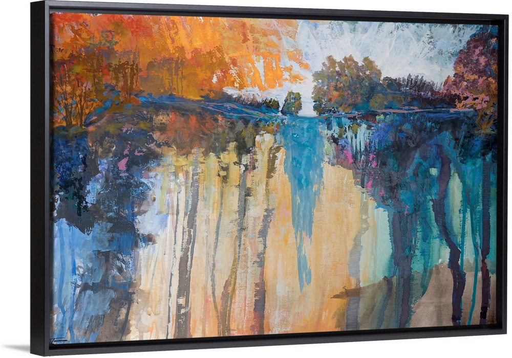 <p>Abstract landscape painting with vibrant dripping hues forming a lake surrounded by trees.</p>