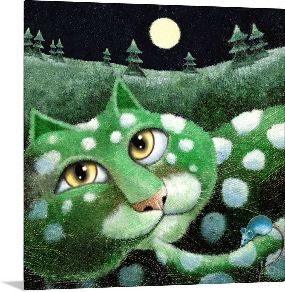 <p>Square painting of a green cat with white and blue toned polka dots and a mouse on its tail.</p>