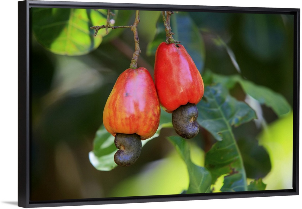 <p>Cashew fruit hanging on tree, close-up.</p>
