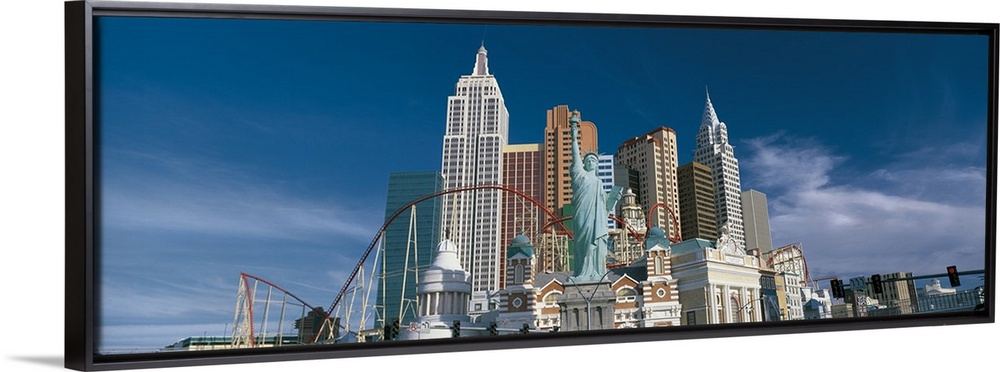 <p>This large panoramic photograph is of a casino in Las Vegas with a roller coaster and a scaled down statue of liberty in front.</p>