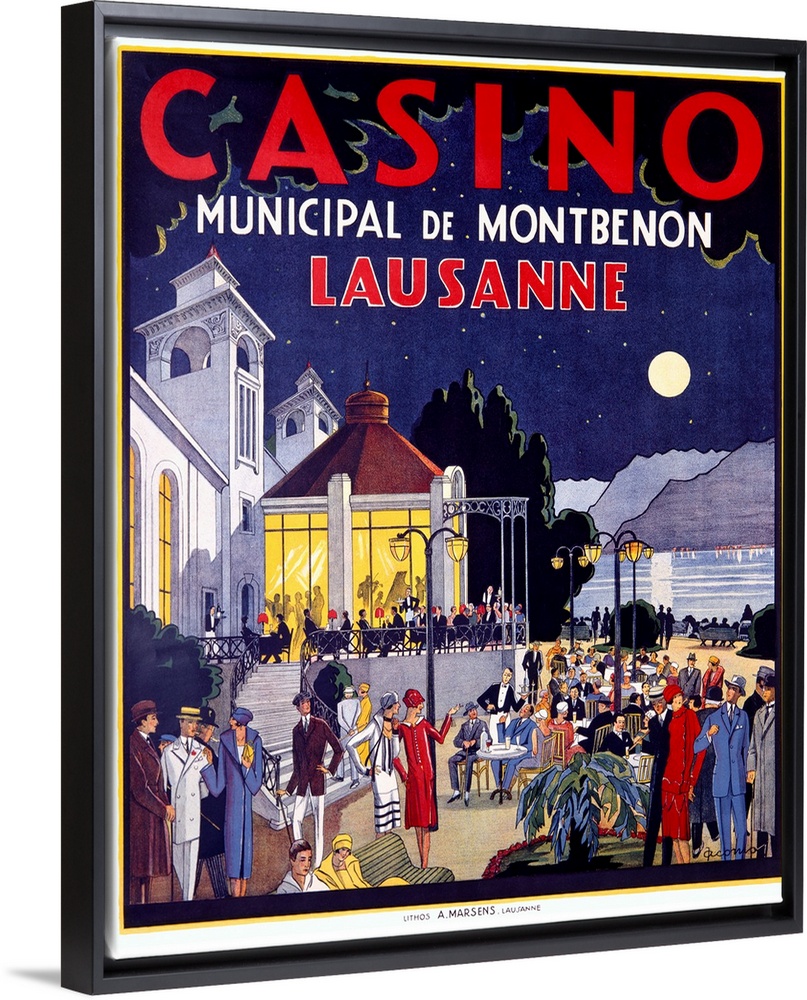 <p>Retro poster on canvas of an advertisement for a casino with a bunch of nicely dressed people standing around outside.</p>