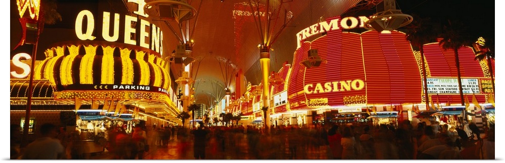 <p>Wide angle photograph on a giant canvas of the casinos with bright lights at night, along Fremont Street in downtown Las Vegas.</p>